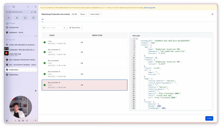 Finally, go to Rudderstack's live events monitor and verify that your events appear there.