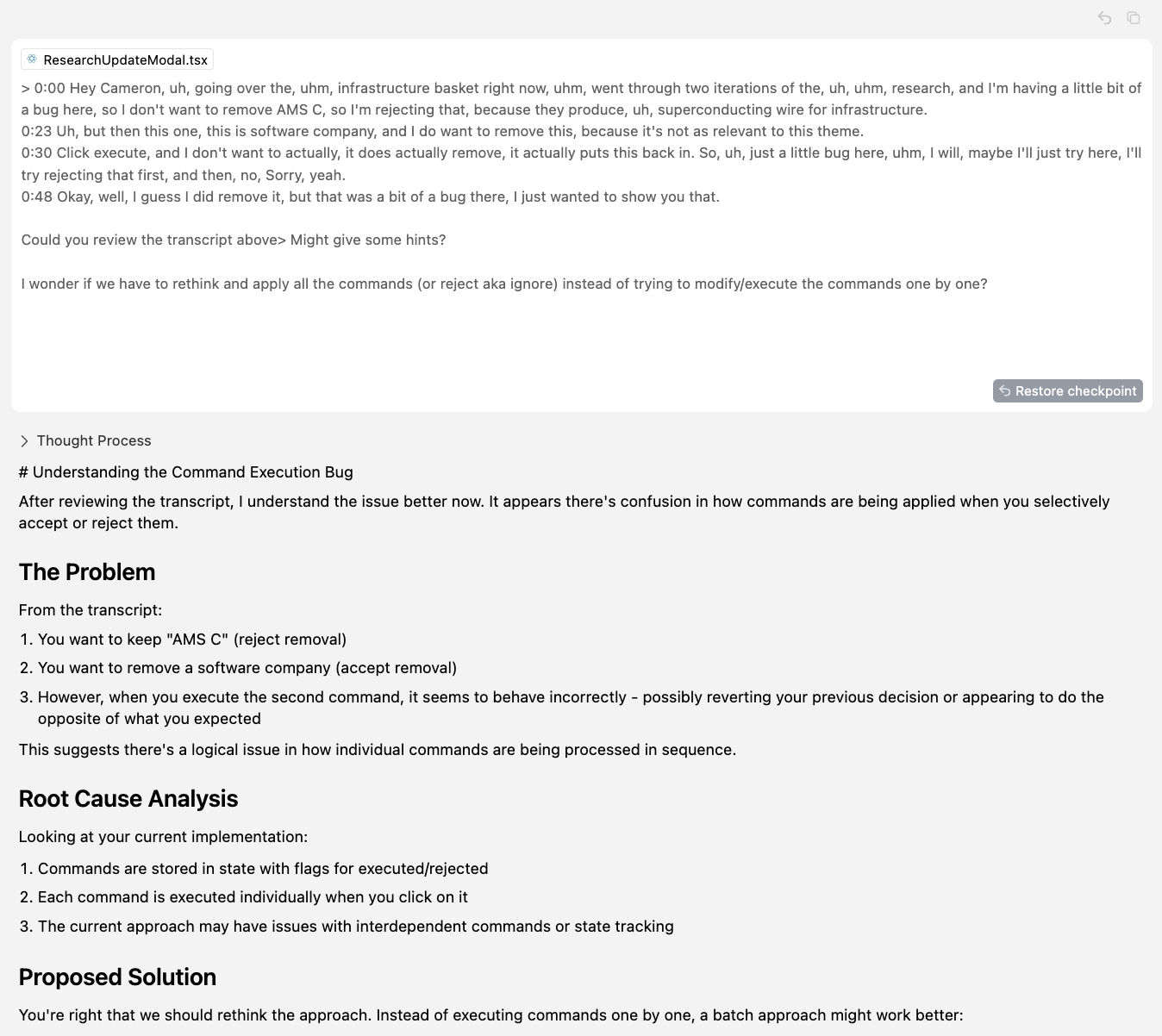 From there, I started thinking: should this workflow change? Instead of applying changes immediately when the user reviews an item, should we queue them up and apply them all at once at the end? I tossed that into the AI, and it gave me an analysis of the current approach versus my idea. We refined it a bit, then I switched into agent mode and had it write up the plan. Now I’m working on it.