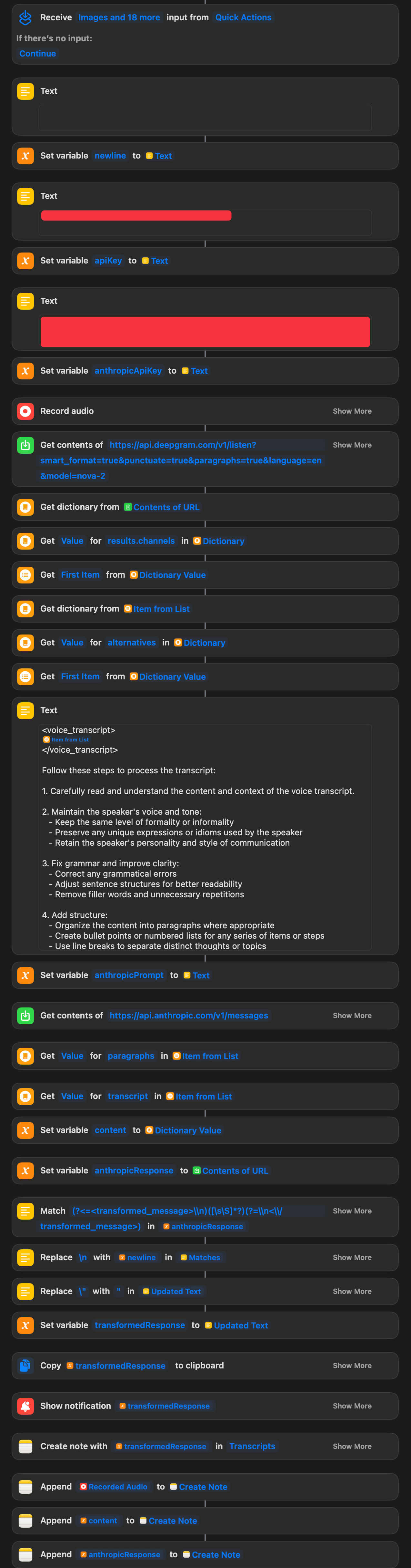 Using Shortcuts.app to capture my voice, run it through multiple models, and output text that I can copy & paste.