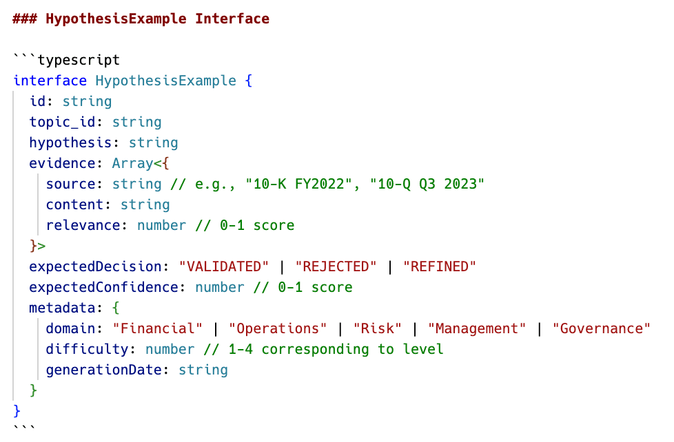 To implement this, I defined a clear TypeScript interface for each example in my dataset: