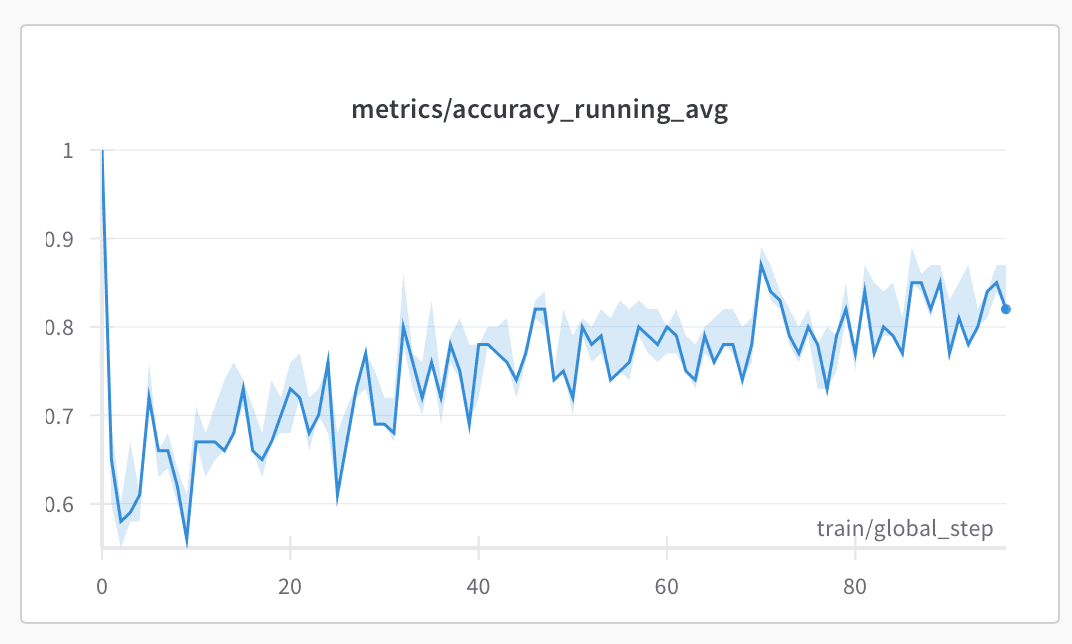 Figure 3: Running average accuracy improving from ~60% to ~82% over training, with confidence intervals shown in light blue.