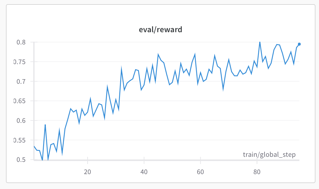 Figure 1: Reward values steadily increasing from ~0.5 to ~0.8 over 95 training steps, with consistent upward trajectory despite expected oscillations.