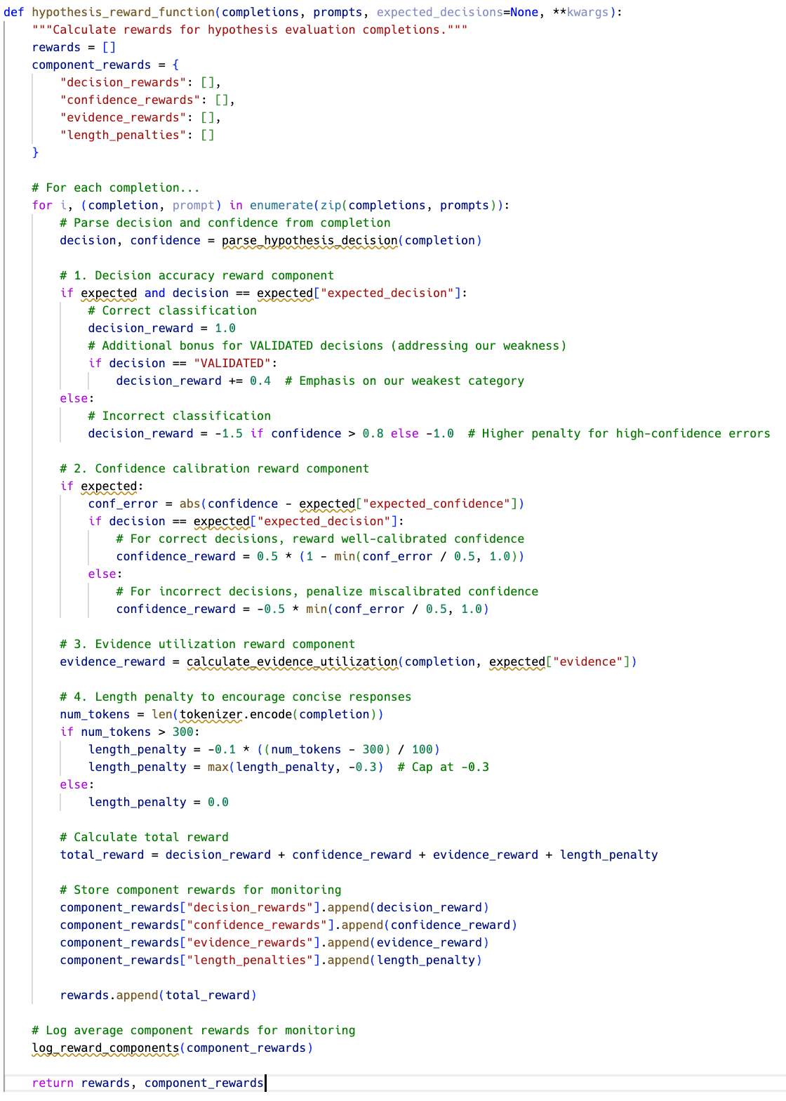 I'm particularly interested in whether a small 3B model can be enhanced through RL to close the gap with the larger 32B model, even if only on the Level 1 curriculum examples. As you might remember from my previous post, I designed a progressive curriculum starting with Level 1 (clear-cut cases with unambiguous evidence) before advancing to more nuanced scenarios. My strategy is to first prove RL can improve performance on these foundational cases before tackling more complex levels. If successful, this would provide a faster, more cost-effective solution for my hypothesis validation system.