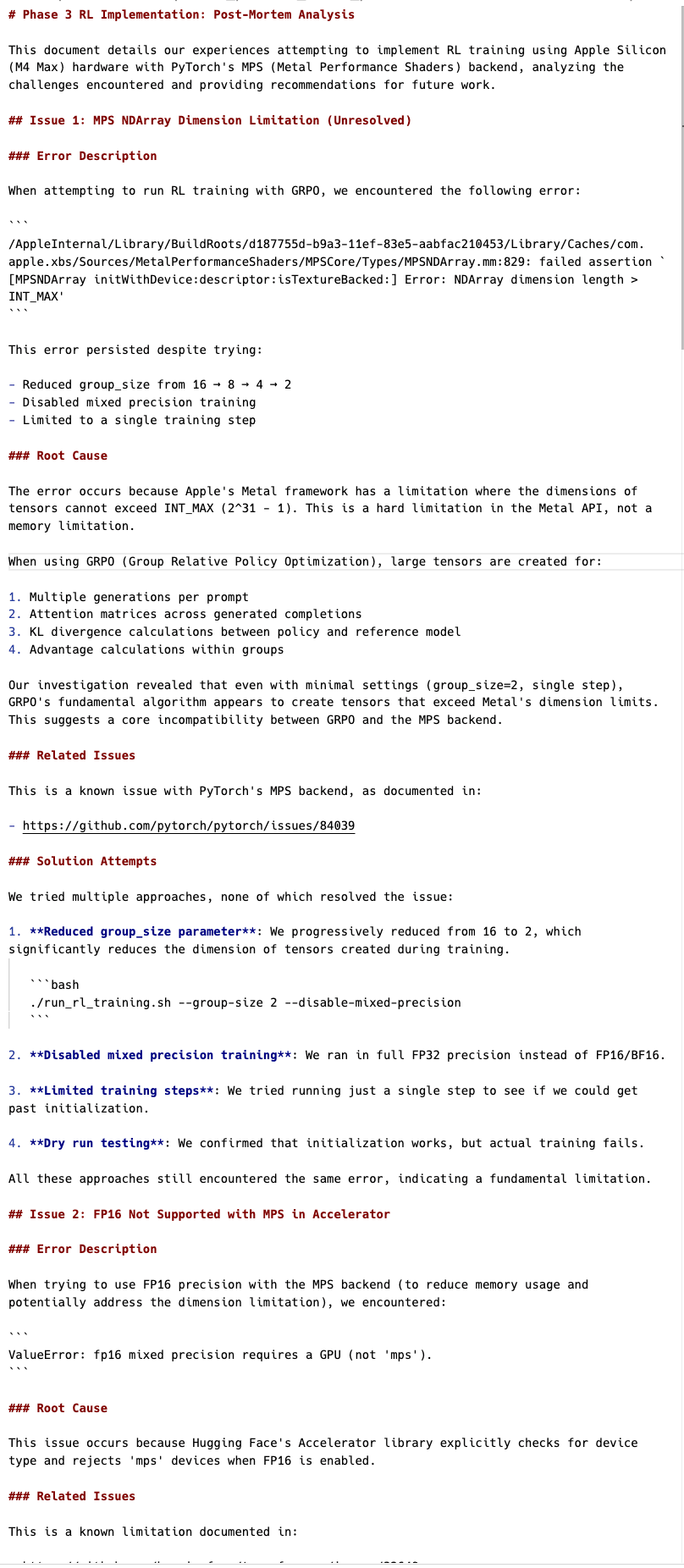 For example, the expert confirmed my batch size of 16 was reasonable for my hardware but recommended profiling during early training to potentially increase it if my GPU wasn't fully utilized. They also noted my KL penalty (β = 0.05) was on the lower side, suggesting I implement adaptive KL monitoring to adjust β if the model started to diverge too much from the reference.