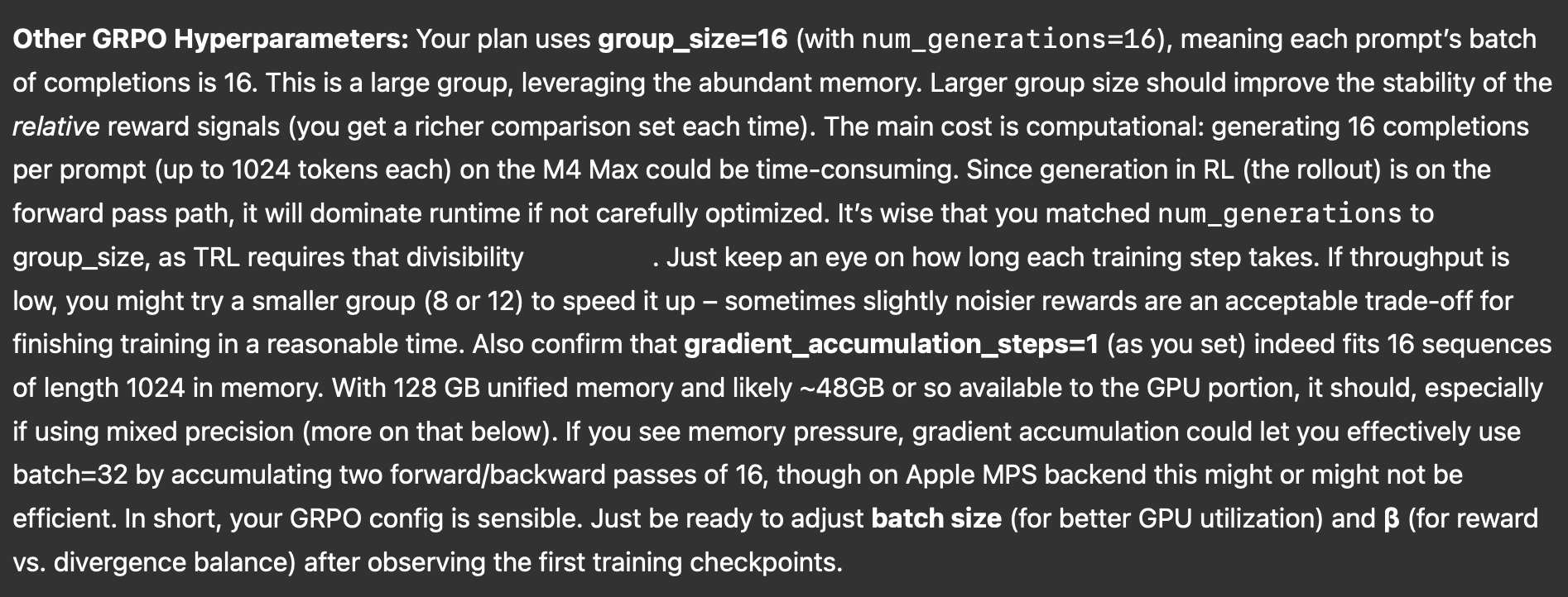 For example, the expert confirmed my batch size of 16 was reasonable for my hardware but recommended profiling during early training to potentially increase it if my GPU wasn’t fully utilized. They also noted my KL penalty (β = 0.05) was on the lower side, suggesting I implement adaptive KL monitoring to adjust β if the model started to diverge too much from the reference.