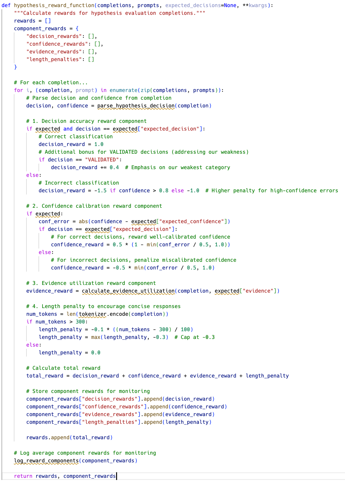 I’m particularly interested in whether a small 3B model can be enhanced through RL to close the gap with the larger 32B model, even if only on the Level 1 curriculum examples. As you might remember from my previous post, I designed a progressive curriculum starting with Level 1 (clear-cut cases with unambiguous evidence) before advancing to more nuanced scenarios. My strategy is to first prove RL can improve performance on these foundational cases before tackling more complex levels. If successful, this would provide a faster, more cost-effective solution for my hypothesis validation system.
