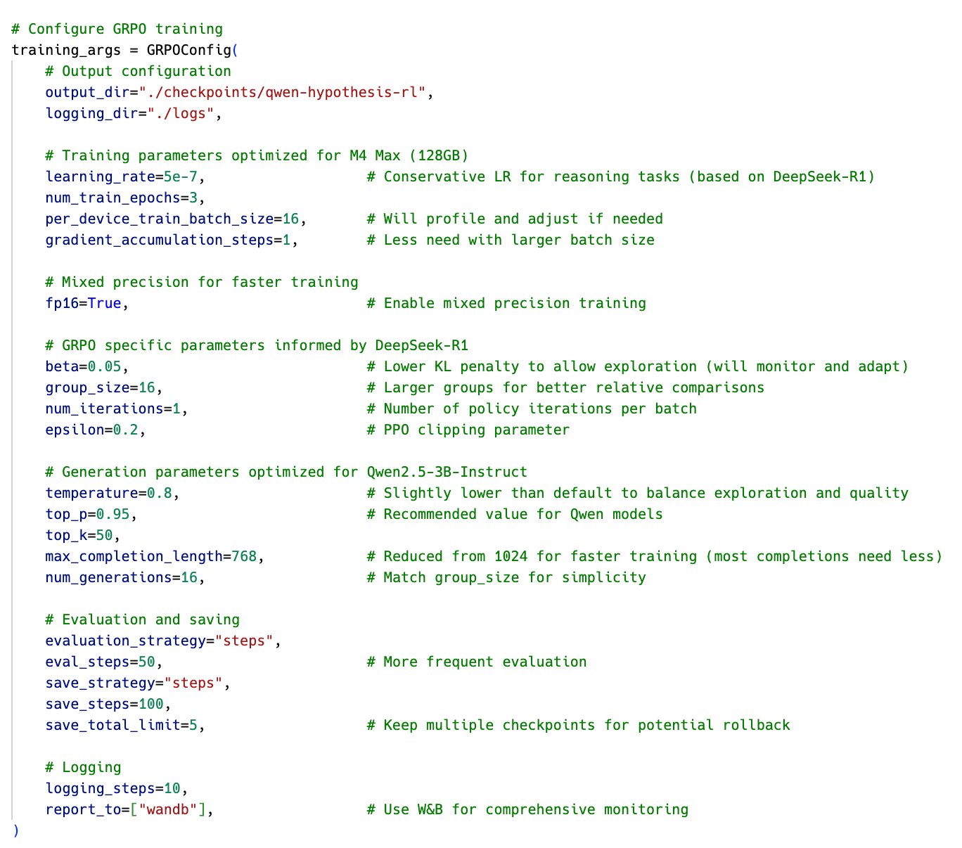 Here’s how I initially configured GRPO for my specific hardware and task: