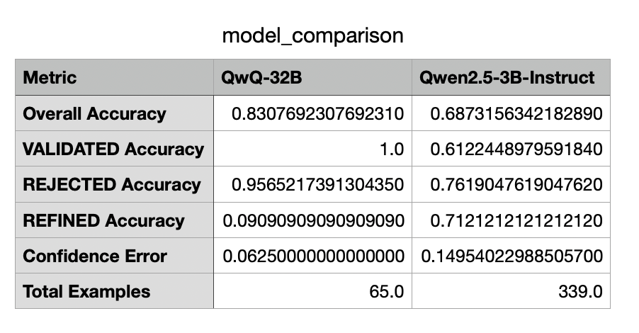 These results were fascinating. The QwQ-32B model crushed it on VALIDATED and REJECTED categories, but performed terribly on REFINED cases. Meanwhile, the much smaller 3B model showed more balanced performance across categories, although lower overall.