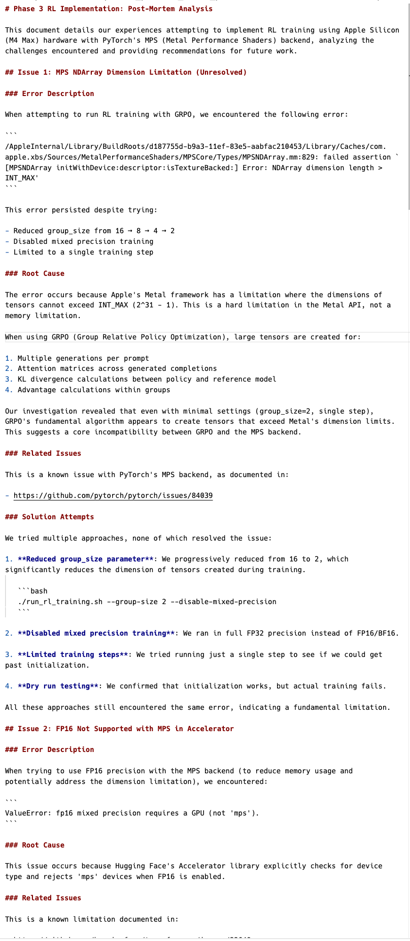 - Hardware matters: Despite “vibe coding” allowing me to tackle complex ML concepts, hardware limitations can still be showstoppers. Apple’s MPS backend for PyTorch has fundamental limitations for certain tensor operations needed in RL.