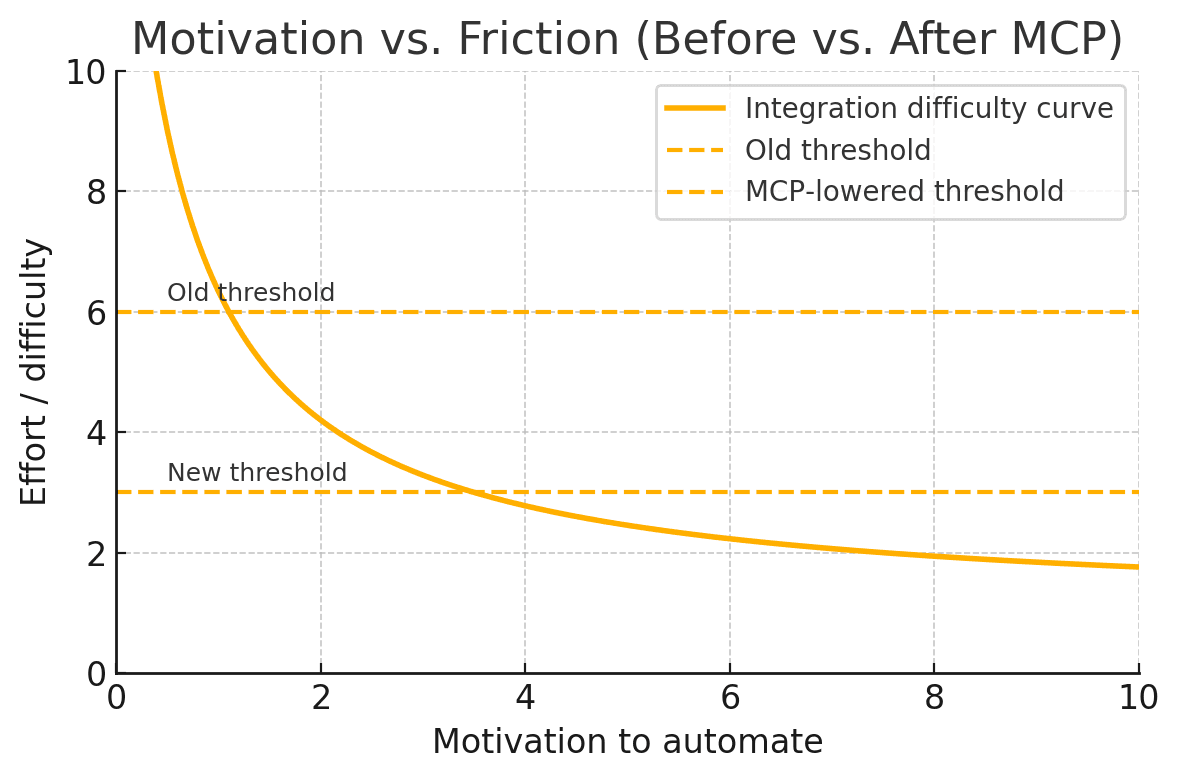 He'd never touched the Jira API before—too many docs and too much OAuth. One evening with Atlassian's MCP server plus an LLM erased the friction. The activation-energy line plummeted, and years of "someday" automations popped into reach.